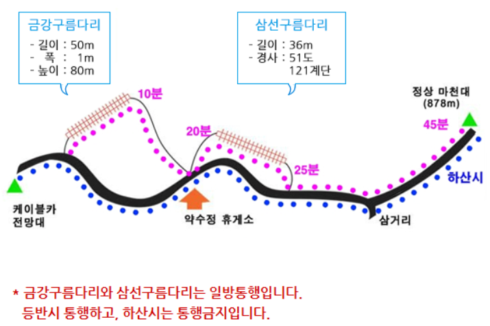 - 1코스 : 주차장→구름다리→삼선계단→마천대 (1.7km, 1시간40분)