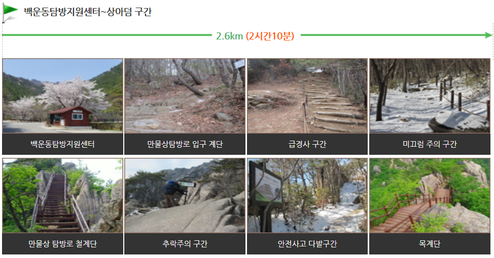 백운동 탐방지원센터부터 상아덤 구간은 2.6km 거리로 2시간 10분 정도 소요됩니다.