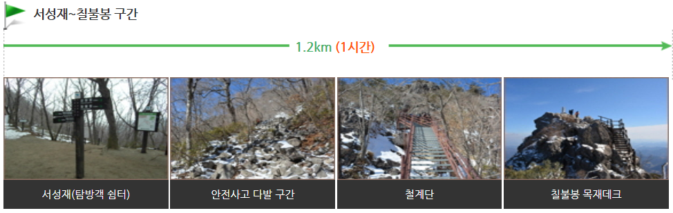 서성재부터 칠불봉 구간은 1.2km정도 거리로 1시간 정도 소요됩니다.