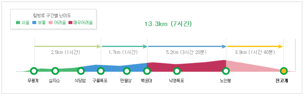 탐방로의 길이가 길고 계곡을 따라 걷는 구간이 많으며, 특히 백운대~노인봉 구간은 경사가 가파르고 바위가 많은 곳으로 안전에 유의해야 하는 코스입니다.