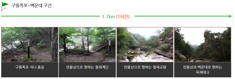 등산코스 : 무릉계 → 십자소 → 연화담 → 식당암 → 구룡폭포 → 만물상 → 백운대 → 낙영폭포 → 노인봉 → 진고개