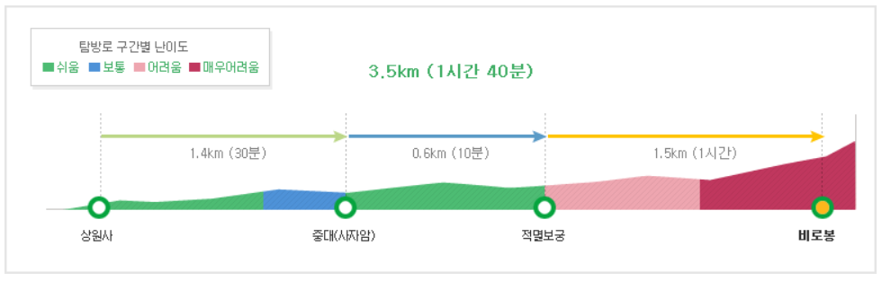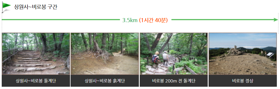 오대산 비로봉 코스 : 1시간 40분 코스로 거리는 약 3.5km이며, 등산 난이도는 '중' 입니다.