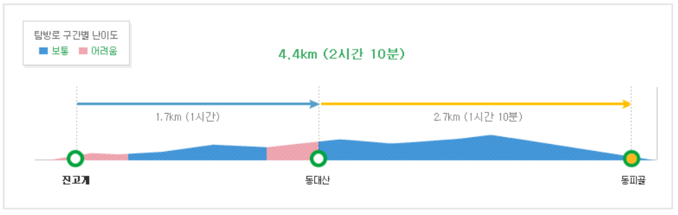 오대산 동대산 코스 : 2시간 10분 코스로 거리는 약 4.4km이며, 등산 난이도는 '중' 입니다.