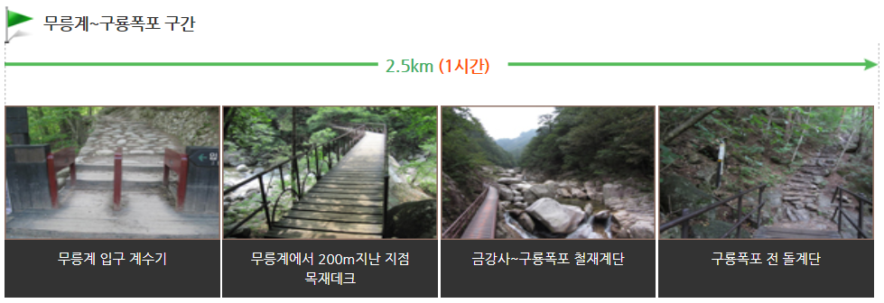 무릉계부터 구룡폭포 전에 있는 금강사까지의 길은 완만한 경사의 오르막길로 누구나 쉽게 오를 수 있습니다.