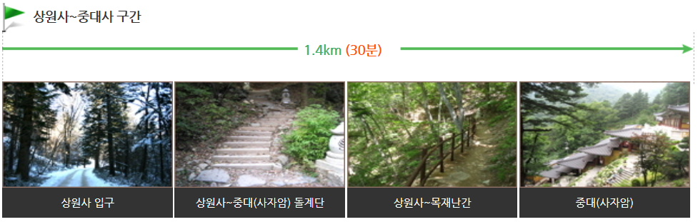 중대사까지의 탐방로는 경사가 완만하고 거리가 적당하여 남녀노소 누구나 쉽게 즐기는 오대산국립공원의 베스트 등산코스 입니다.