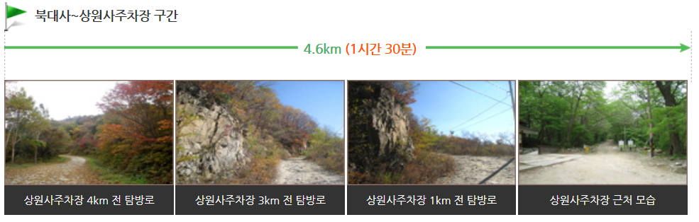 탐방 코스에는 나와 있지 않지만 두로령에서 다시 상원사주차장까지 내려오는 시간까지 더하면 총 7시간 정도가 걸리는 등산코스 입니다.