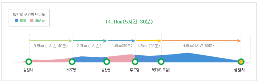 경사가 험한 코스는 아니지만, 거리가 14.1km로 꽤 긴 구간의 등산코스 입니다.