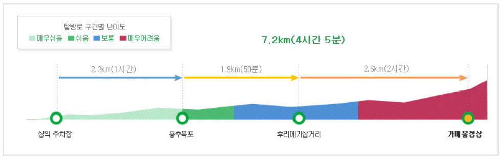 등산코스 : 상의주차장 → 용추폭포 → 후리메기 → 가메봉 → 용연폭포 → 절구폭포 → 상의주차장