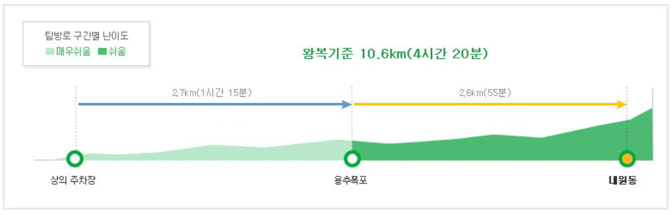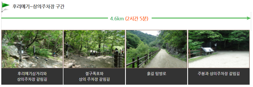 절구폭포~상의주차장 탐방로 구간은 평탄한 흙길 탐방로이며, 약 4.6km구간에 시간은 2시간 5분정도 소요됩니다.