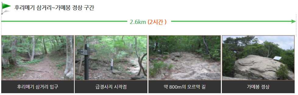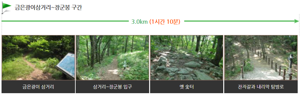 이곳 금은광이 삼거리에서 장군봉까지의 산행은 내리막 탐방로와 잔자갈이 유난히 많으므로 항상 조심을 하셔야 합니다.