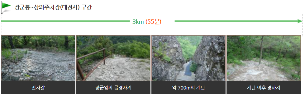 잔자갈이나 바위가 많으며 특히 장군암의 경사는 아주 심하니 특히 조심하셔야 합니다. 장군암을 내려온 뒤에는 약 700m가 목책계단으로 이루어져 있습니다.