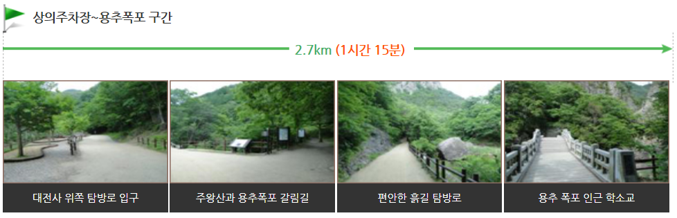 주왕계곡 탐방로의 상의주차장~용추폭포 구간은 평탄한 흙길 탐방로이며, 약 2.7km구간에 소요시간은 1시간 15분 정도 소요됩니다.