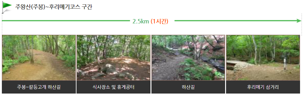 주왕산(주봉) 정상에서 후리메기 삼거리 이정표(좌측)를 따라 가면 내리막 길이 보임. 주왕산(주봉)~칼등고개~후리메기코스까지의 거리는 약 2.5km로 시간은 약 1시간 정도 소요됨. 탐방로 구간구간에 이정표와 다목적위치표지판이 있어 길 찾기에는 별 어려움은 없습니다.
