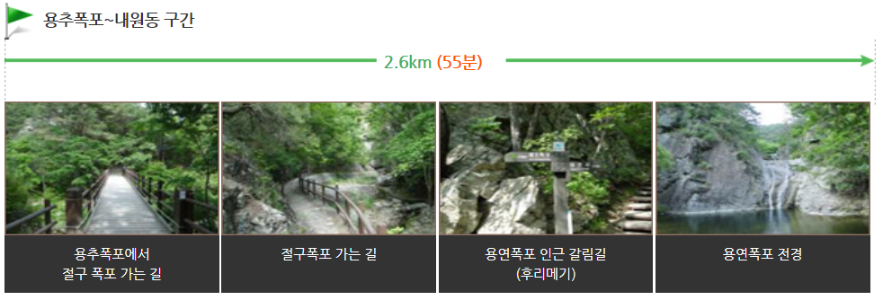 상의주차장에서 용추폭포, 절구폭포, 용연폭포, 내원동 옛 터를 탐방하는 코스(5.3km, 2시간 10분 소요)로 완만한 경사를 따라가는 산책코스로 부담 없이 온가족이 함께 탐방가능합니다.