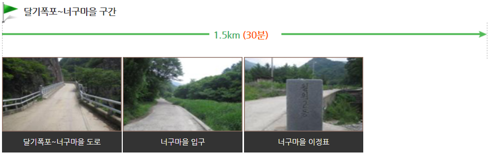 월외탐방지원센터를 지나서 보면 너구마을 입구까지는 시멘트로 포장되어 있으며, 계곡 길을 따라 콘크리트 포장이 되어있기 때문에 발에 피로도가 높을 수 있으니 계곡의 경치를 즐기면서 여유를 가지고 탐방을 하시는 것을 추천드립니다.