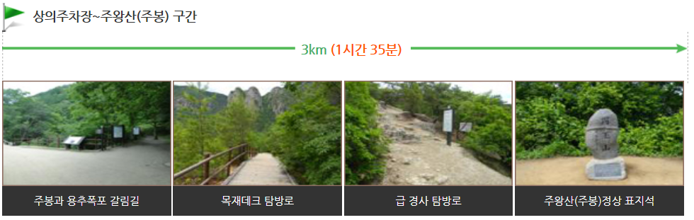 등산코스 : 상의주차장 → 대전사 → 주왕산 → 칼등고개 → 후리메기 → 용추폭포 → 상의주차장