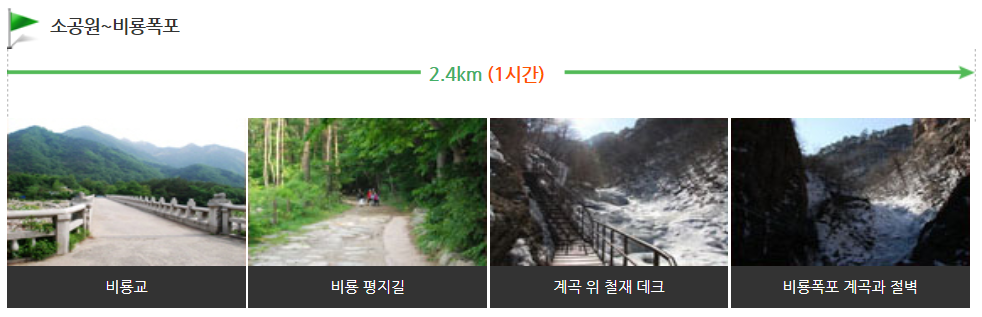 비룡폭포 등산코스 : 소공원 → 육담폭포 → 비룡폭포 → 토왕성폭포전망대