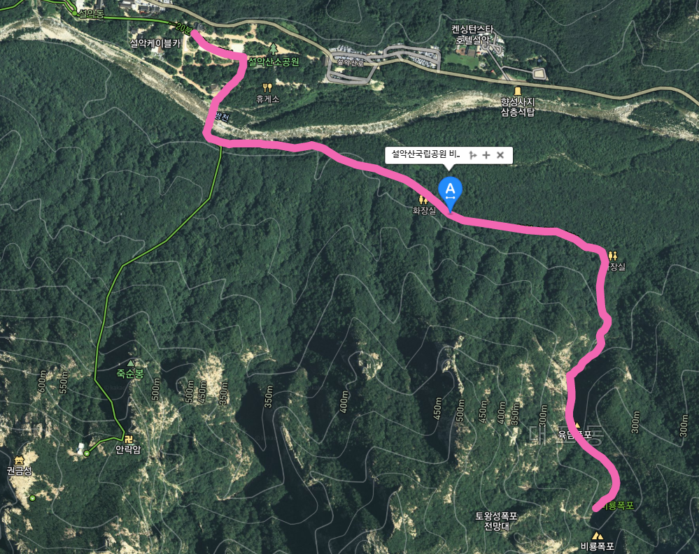 소공원에서 편도 1시간반정도로 가까이 위치하고 있어, 설악산의 유명한 폭포(육담, 비룡,토왕성)를 비교적 쉽게 접할 수 있는 부담 없는 코스입니다.