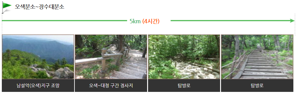 남설악탐방지원센터에서 대청봉까지 가장 빠르게 오르는 최단거리 코스(편도 5.0km, 4시간 소요)로 양양군 오색리에서 출발하여 설악폭포를 거쳐 대청봉까지 오르는 등산코스입니다.