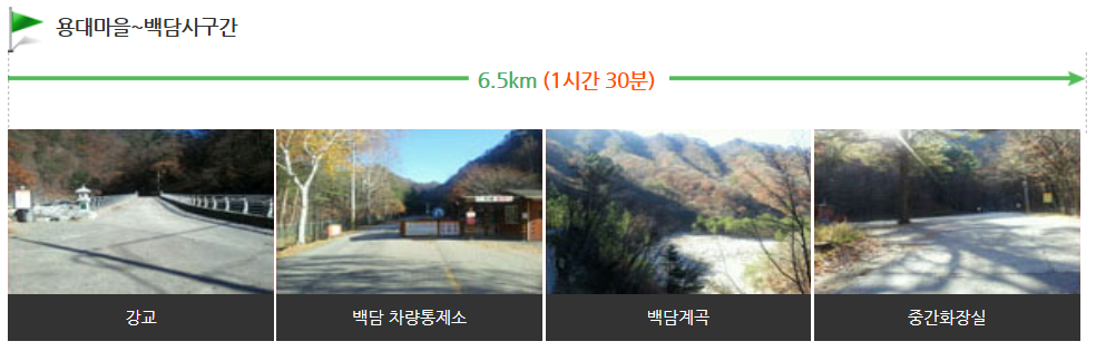 본 코스는 어린이나 노약자도 탐방하는데 큰 무리가 없으며 봄철(5월) 계곡 변 버드나무와 가을철(10월~11월) 단풍 절경 탐방 코스입니다.
