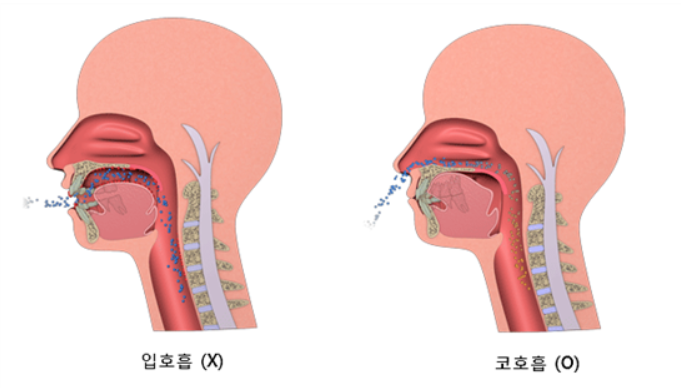 구강으로 호흡할 때는 공기중의 먼지 및 세균 등 이물질 걸러지지 않게 되며, 건조한 환경에서 호흡시 구강내 점막이 마를 수 있어 구강건조증이 생길 확률이 높아집니다.