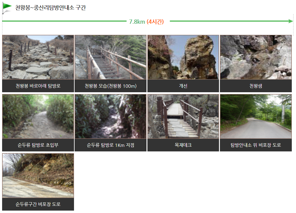 비탈진 곳, 목재데크와 암석이 많아서 무리한 산행은 하지 않는 것이 좋으며, 천왕봉에서 100m구간은 급경사에 암석으로 된 돌계단이 많아 주의가 필요합니다.