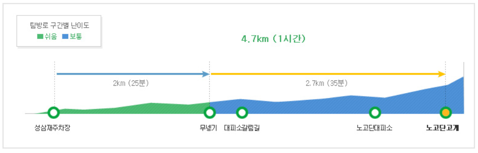 노고단 코스 : 편도 1시간 코스로 거리는 약 4.7km이며, 등산 난이도는 '하' 입니다.
