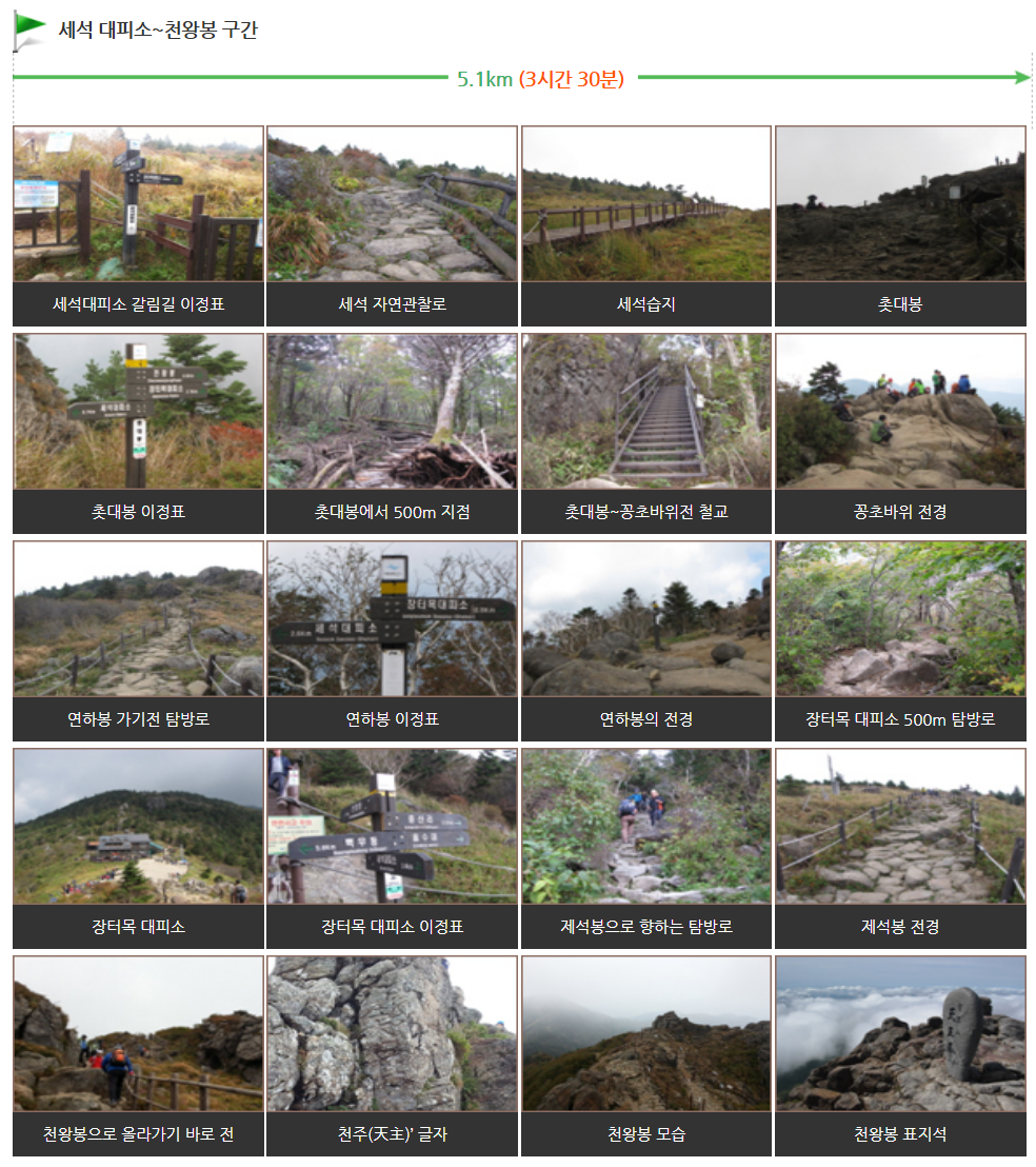 잔돌이 많아 세석이라는 이름이 붙은 세석평전은 철쭉이 아름답기로 소문난 곳이기도 한 세석에서 천왕봉구간은 약 5.1km에 3시간 30분 정도 소요됩니다.