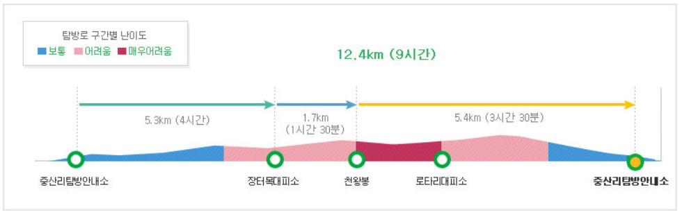 암석 및 목재 데크가 많고 경사가 심해서 산행이 초보이거나 체력이 약한 사람에게는 자신에 맞는 산행을 하기를 추천합니다.