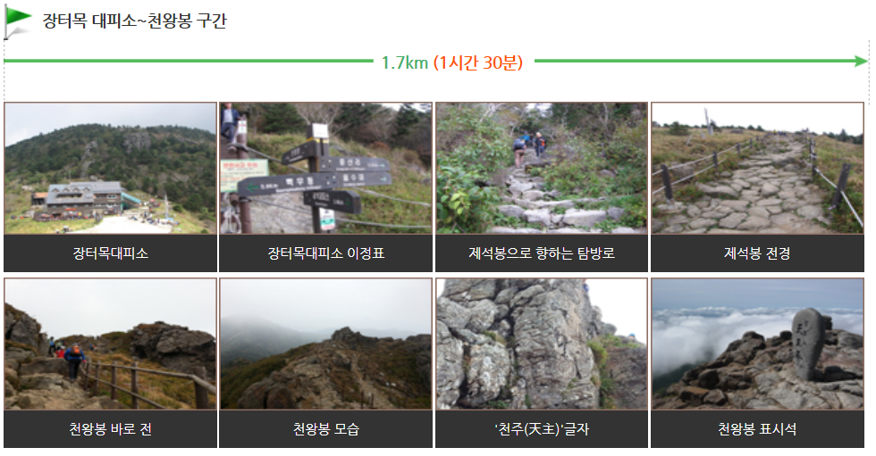 맑은 날 남해 앞바다와 남해대교가 한눈에 보이는 장터목에서 천왕봉 구간은 약1.7km , 1시간 30분 소요되는 구간입니다.