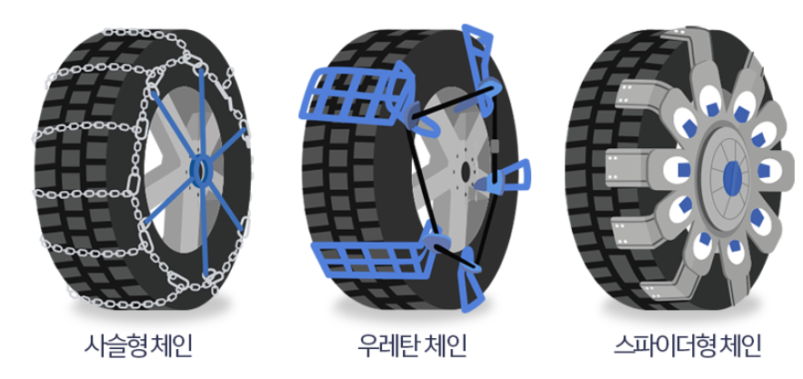 자동차 체인(스노우 체인)의 종류는 재질과 장착 방법 등에 따라 아래와 같은 종류가 있습니다.