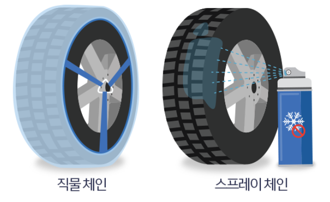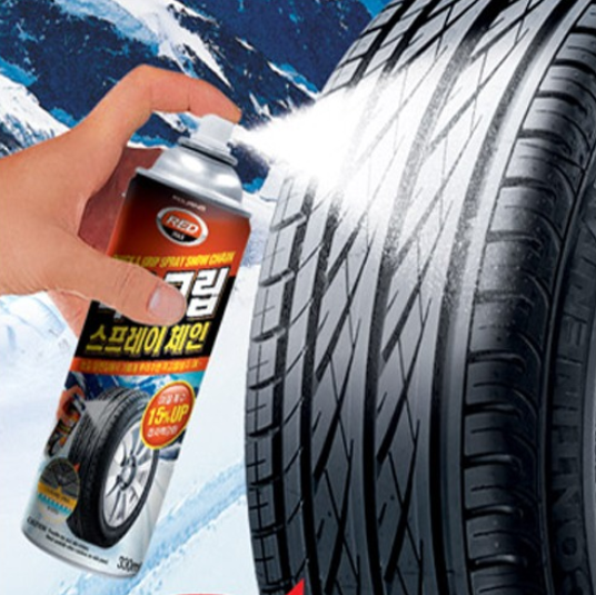 눈길 주행 전 타이어 표면에 스프레이 체인을 골고루 뿌리면 타이어의 표면에 고분자수지(송진)가 코팅되어 접지력을 높여주는 방식입니다.