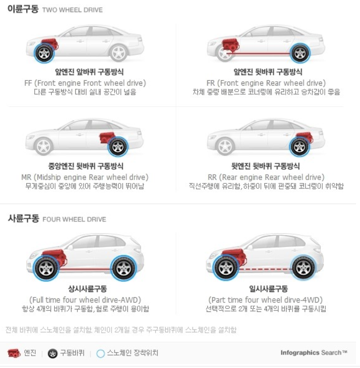 - 4륜 자동차 : 기본 구동축 바퀴 2개에 장착(보통 SUV경우 앞바퀴가 구동축)