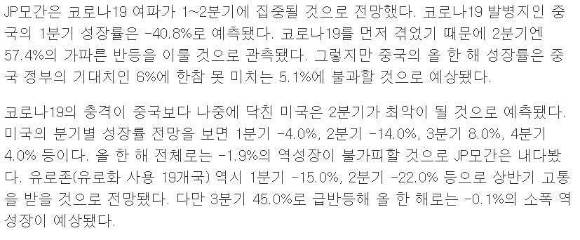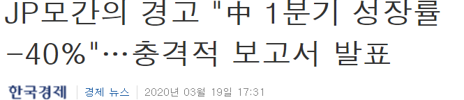 JP모간에서는 중국의 1분기 경제성장률이 -40%에 달할 것이라고 보고 있습니다.
