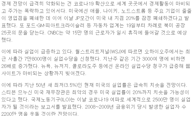 2008년 금융위기 당시 실업자수를 웃돌 것이라고 하네요... (ㅠㅠ) 이 전망이 틀리길 바라봅니다.