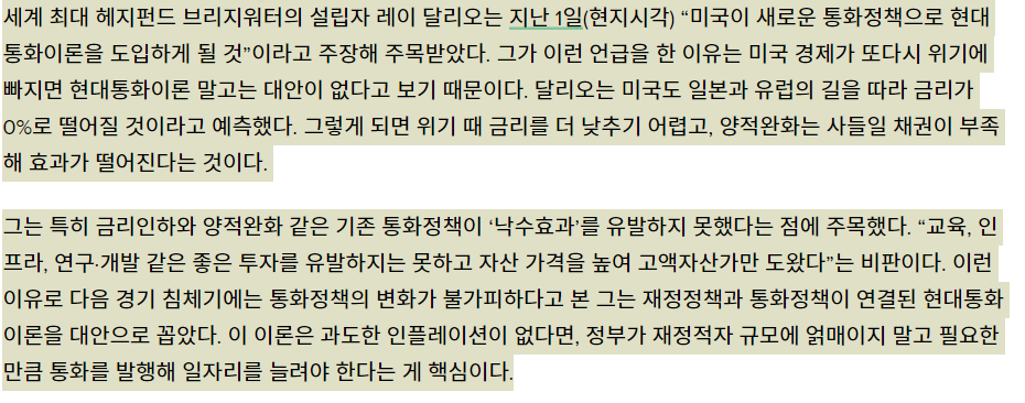 요즘 나름 핫한 레이달리오의 현대통화이론에 대한의견(아래 글)