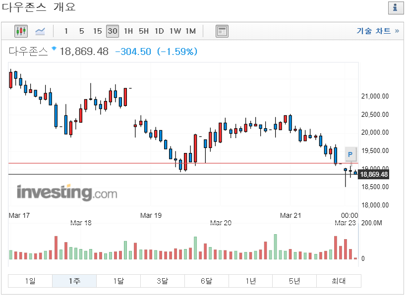 연준의 이러한 노력을 아는지 모르는지 미국 주식시장(다우존스)는 오늘도 하락하고 있습니다.