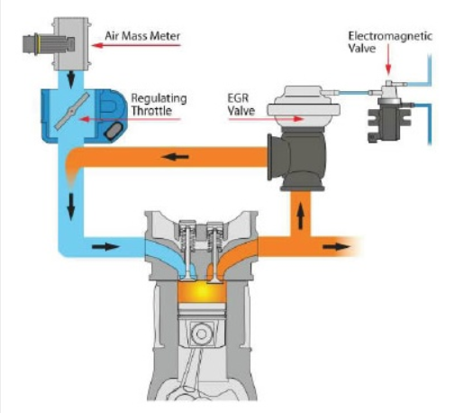 - 구조와 원리 : 엔진의 배기가스 일부를 엔진 실린더 내부로 재순환 시키면서 배기가스의 재연소 및 연소지연을 통한