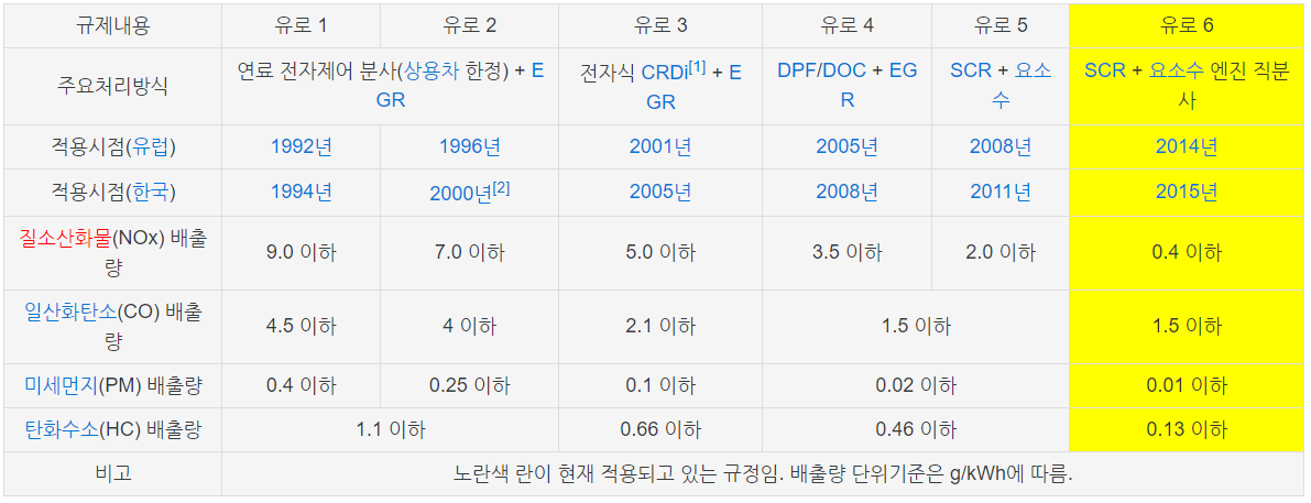 * 유로1 ~ 유로6 규제 내용(표)