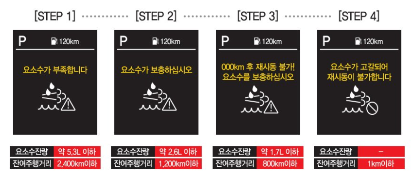 요소수는 보통 계기판에 잔량이 나오게 되며 부족할 경우 차량에서 친절하게 요소수가 부족하다는 알람이 뜨며, 일정 킬로 수 이상 주행시 시동이 걸리지 않거나 속도가 제한되는 경우도 있으니, 차량별로 요소수가 부족하지 않게 요소수를 보충해 줘야 합니다.