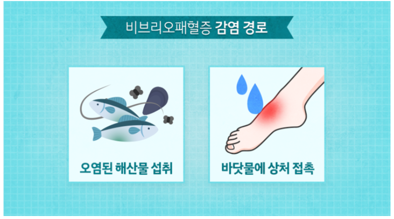 2. 비브리오 패혈증의 감염경로 : 비브리오균이 증식한 어패류나, 피부의 상처 부위에 바닷물이 접촉했을 때 감염을 일으키게 됩니다.