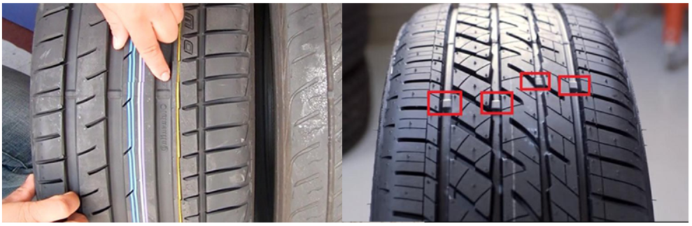 타이어와 지면이 맞닿는 부분에 여러 홈들이 파여있는데, 그 사이를 보시면 위 그림에 표시된 것 과 같은 모양이 있습니다. 타이어 트레드 홈에 굵은 선으로 튀어나와 있으며, 높이는 타이어의 외곽면 보다 약간 낮습니다.
