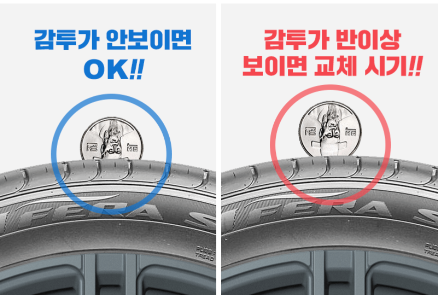 100원짜리 동전을 타이어 트레드 홈에 끼웠을 때 이순신 장군님의 감투가 반 이상 보이면 타이어를 교체해줘야 한다는 뜻입니다.