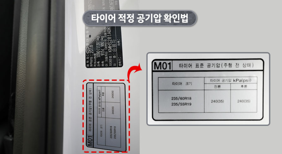 대부분 자동차의 운전석 도어를 열면 자동차 섀시에 금속 스티커로 장착 가능한 타이어의 크기와 표준 공기압이 표기되어 있습니다. 해당 기준에 맞춰 타이어 선택 및 공기압을 맞추시는 게 좋습니다.