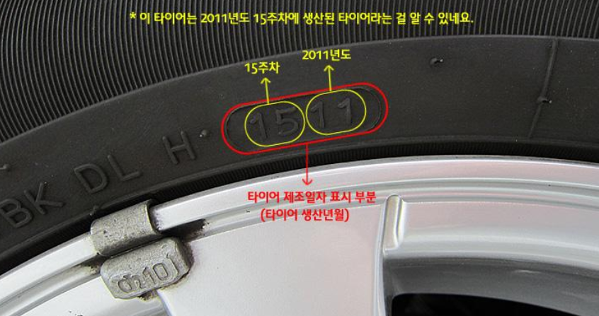 타이어의 경우 고무를 주재료로 하기 때문에 겉으로는 멀쩡해 보여도 시간이 지남에 따라 경화가 발생되게 됩니다. 타이어를 교체할 때 타이어 옆면의 제조 날짜를 확인하셔서 최근에 생산한 타이어로 교체해주시는 것이 좋습니다.
