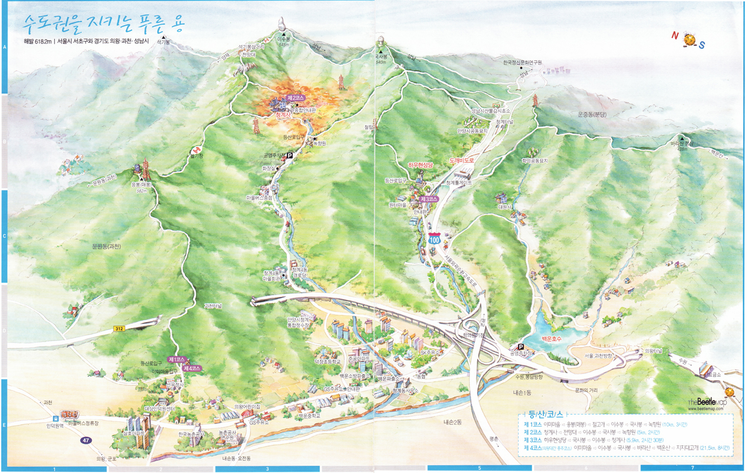 - 약 5시간 소요 : 원터골 입구 → 청계사 → 길마재→돌문바위→ 매바위 →매봉 →망경봉 →망경대 →헬기장 →청계계곡 → 옛골