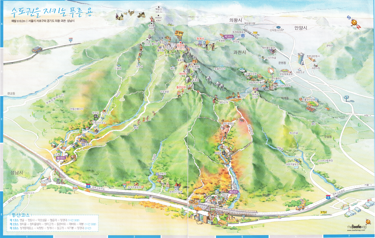 - 2.13km / 약 1시간 소요 : 청계골 입구 → 청계골 약수터 → 길마재 정자 →헬기장 →매봉