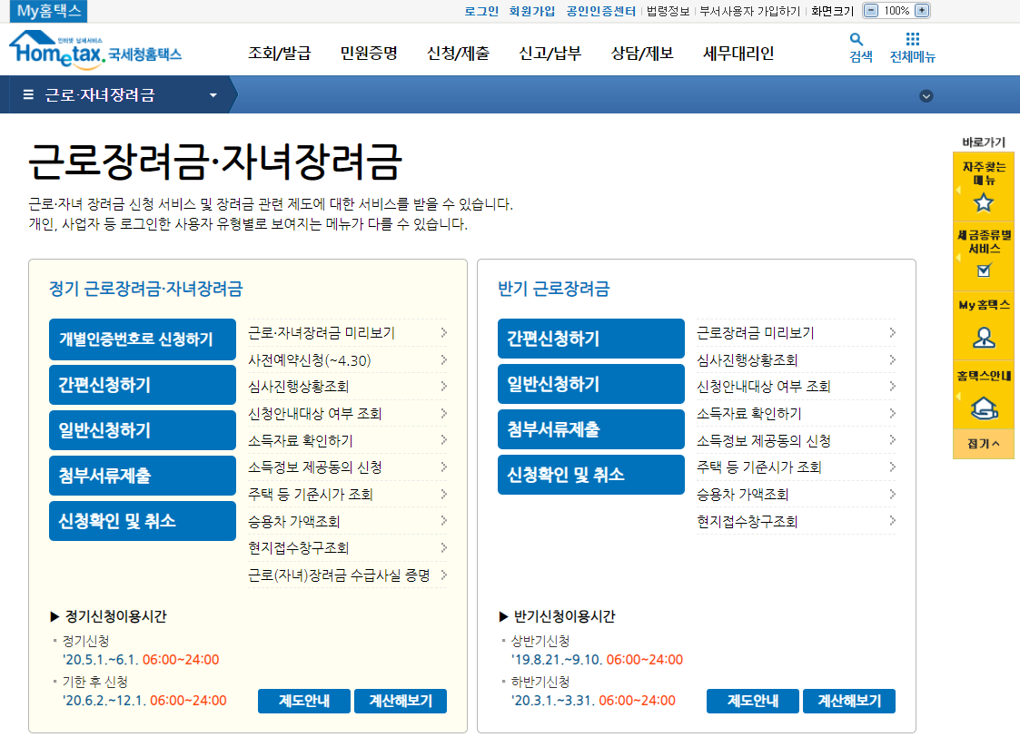 * 국세청홈택스 로그인 → 신청·제출 → 근로·자녀장려금 신청하기 → 간편신청하기 → 신청요건 확인