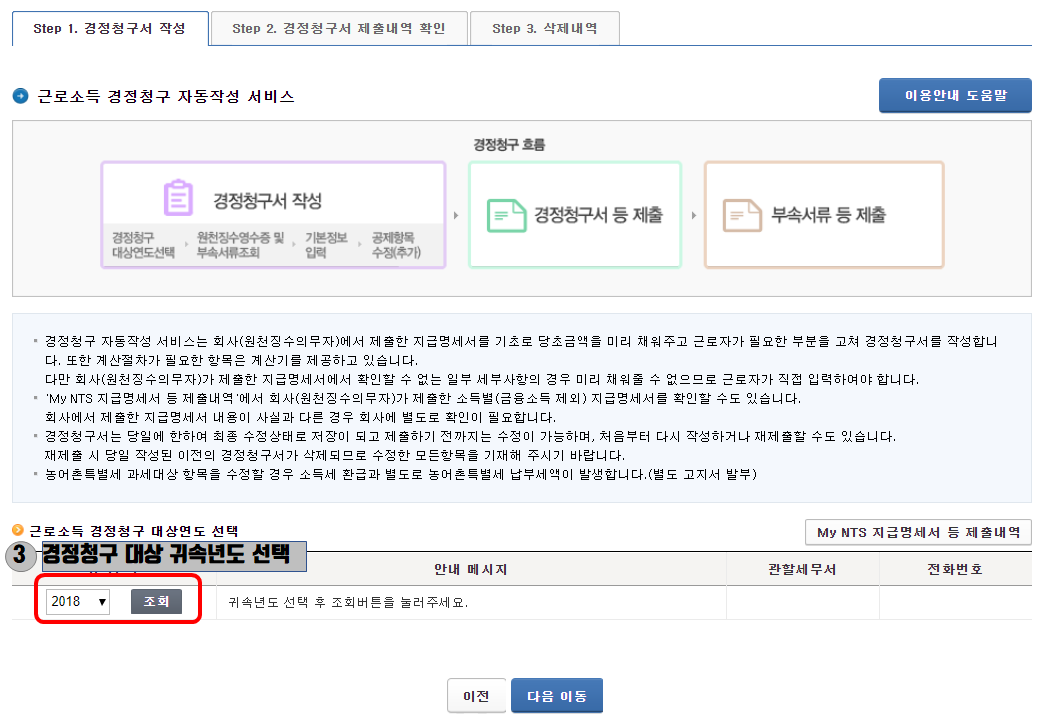 3) 경정청구를 신청할 소득 연도를 선택하면 경정청구서를 작성할 수 있습니다.
