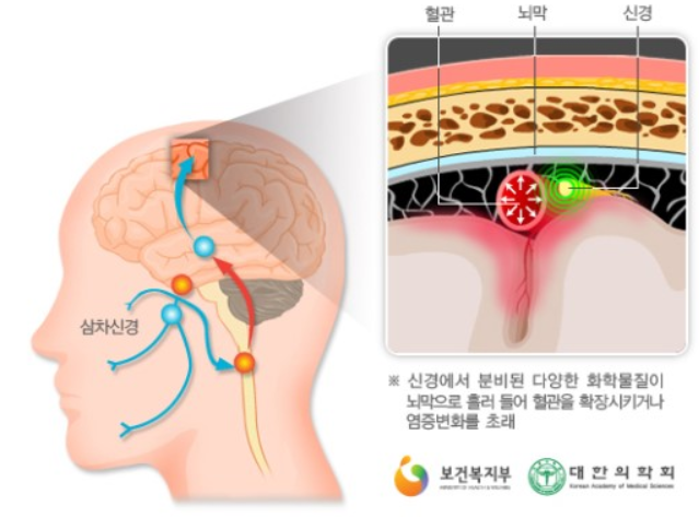 삼차신경에서 주변의 혈관에 염증을 일으키는 다양한 화학물질을 분비하여 신경 섬유가 통증에 더욱 민감하게 되고 혈관을 확장시킨다는 것이 알려져 있습니다.